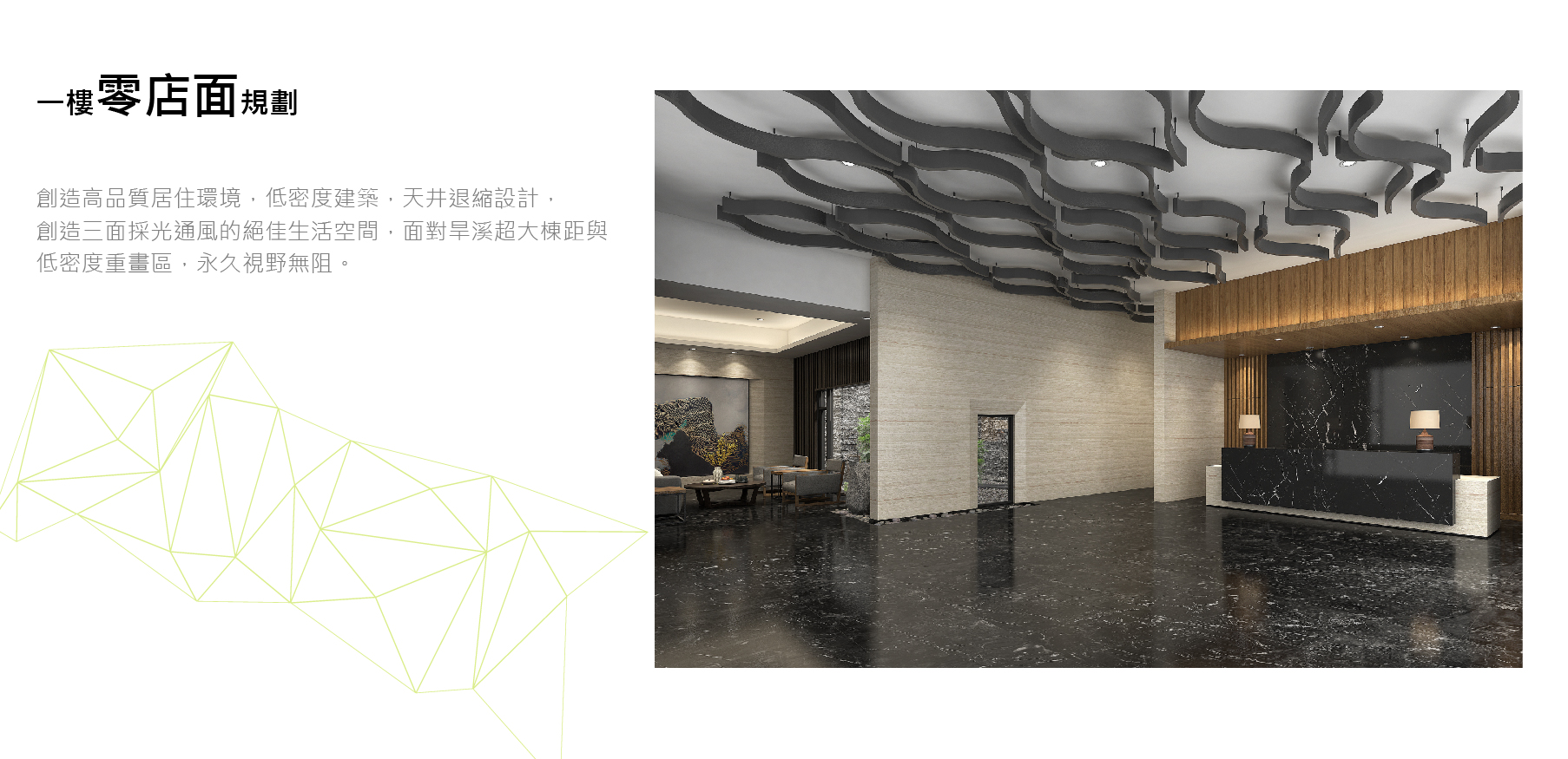 一樓零店面規劃,創造高品質居住環境,低密度建築,天井退縮設計,