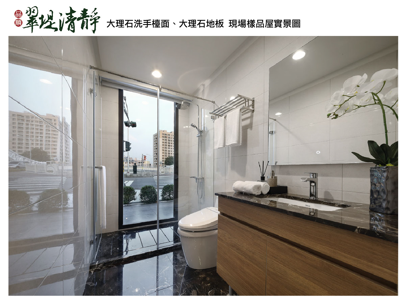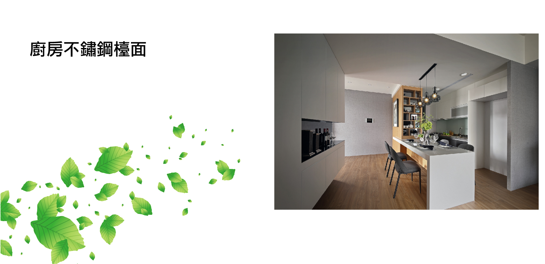 臥室仿實木地板|主臥衛浴天然石材|主臥免治馬桶設備|大理石洗手檯面|廚房不鏽鋼檯面